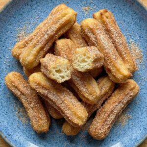 These air fryer churros are one of my favorite treats to make at home. They come out golden and crispy on the outside, soft on the inside, and coated in cinnamon sugar.