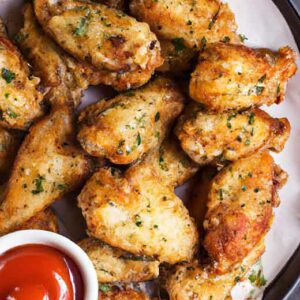 Remove from the air fryer and serve with parsley on top and your favorite dipping sauce. That’s it! Enjoy these tasty air fryer garlic parmesan chicken wings!