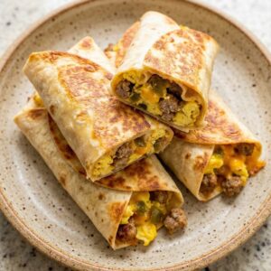 You only need about 10 common ingredients to pull these together. Eggs, breakfast sausage, cheddar cheese, hash browns, green chilies, and flour tortillas do most of the work.