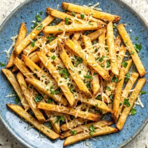 - Transfer to a serving plate, sprinkle with fresh parsley, and serve right away while the fries are at their crispiest.